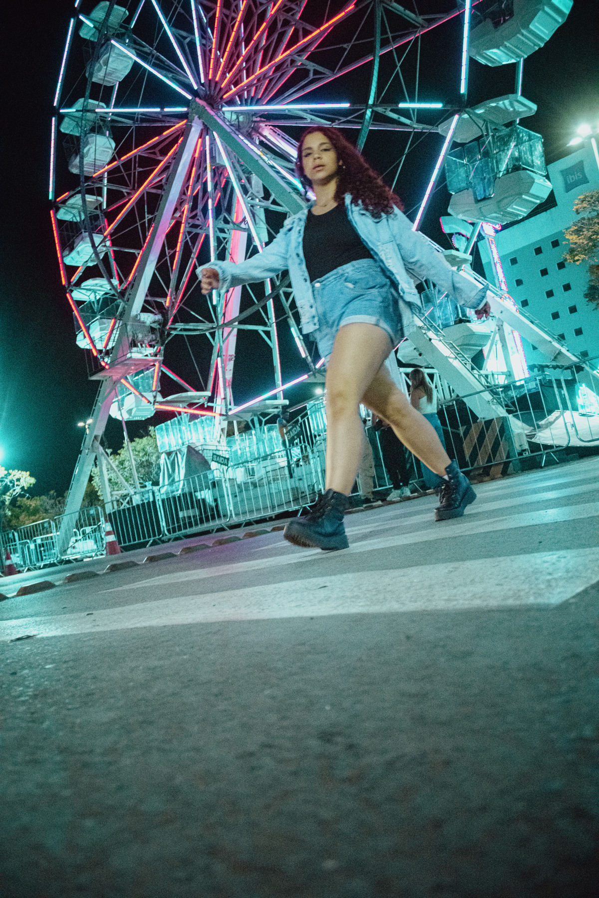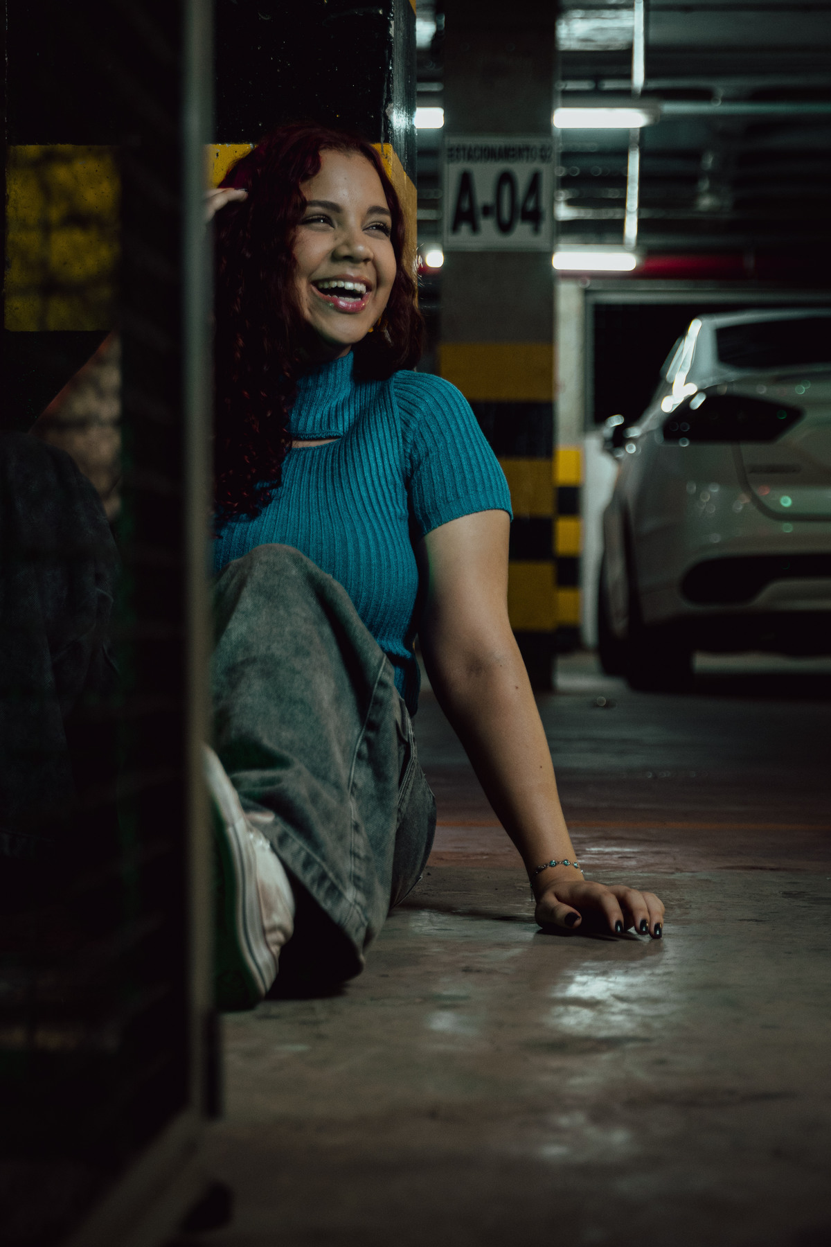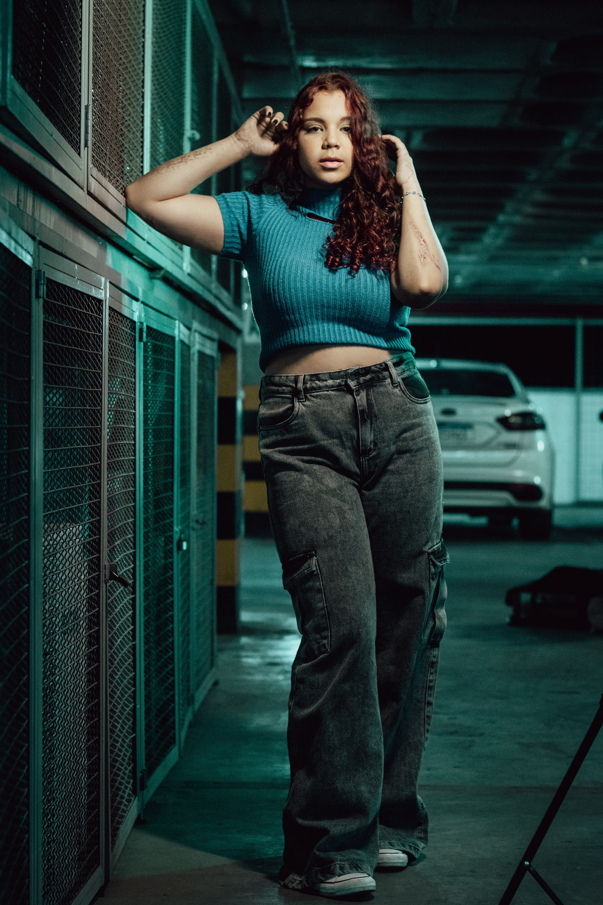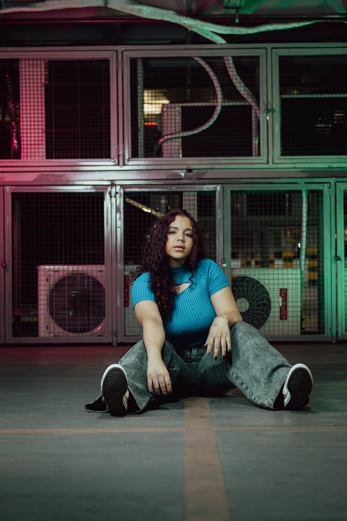 Este ensaio foi uma experiência única, realizada no estacionamento movimentado do shopping e no parque de exposição lá presente. Utilizamos luzes coloridas para criar um ambiente vibrante e contemporâneo, que combinava perfeitamente com a estética urbana que buscávamos.