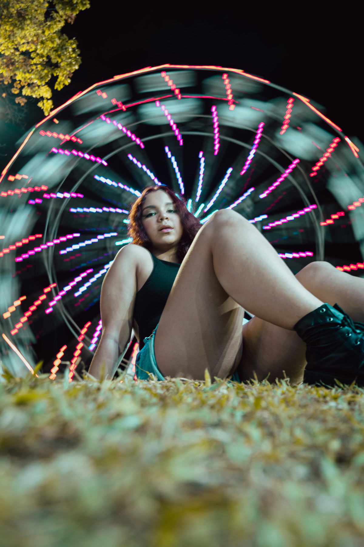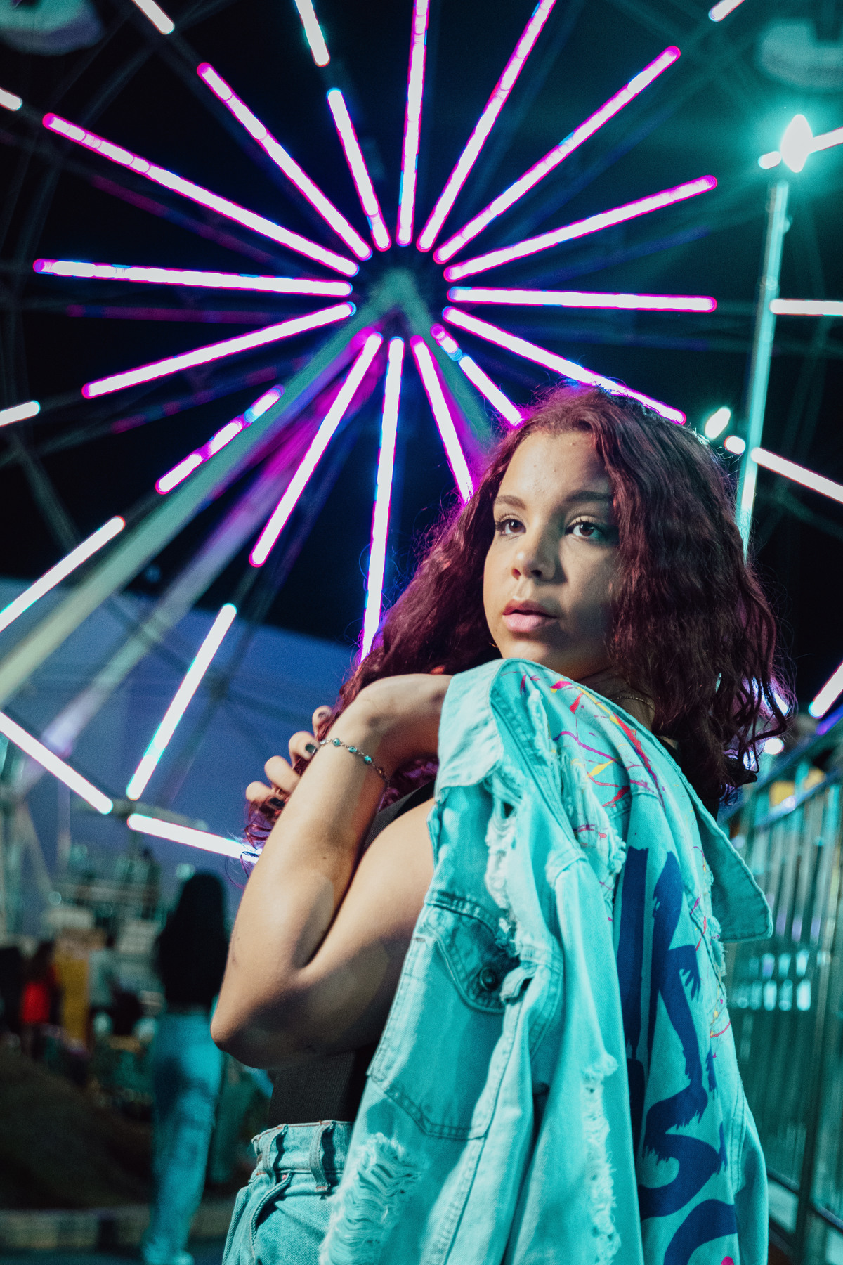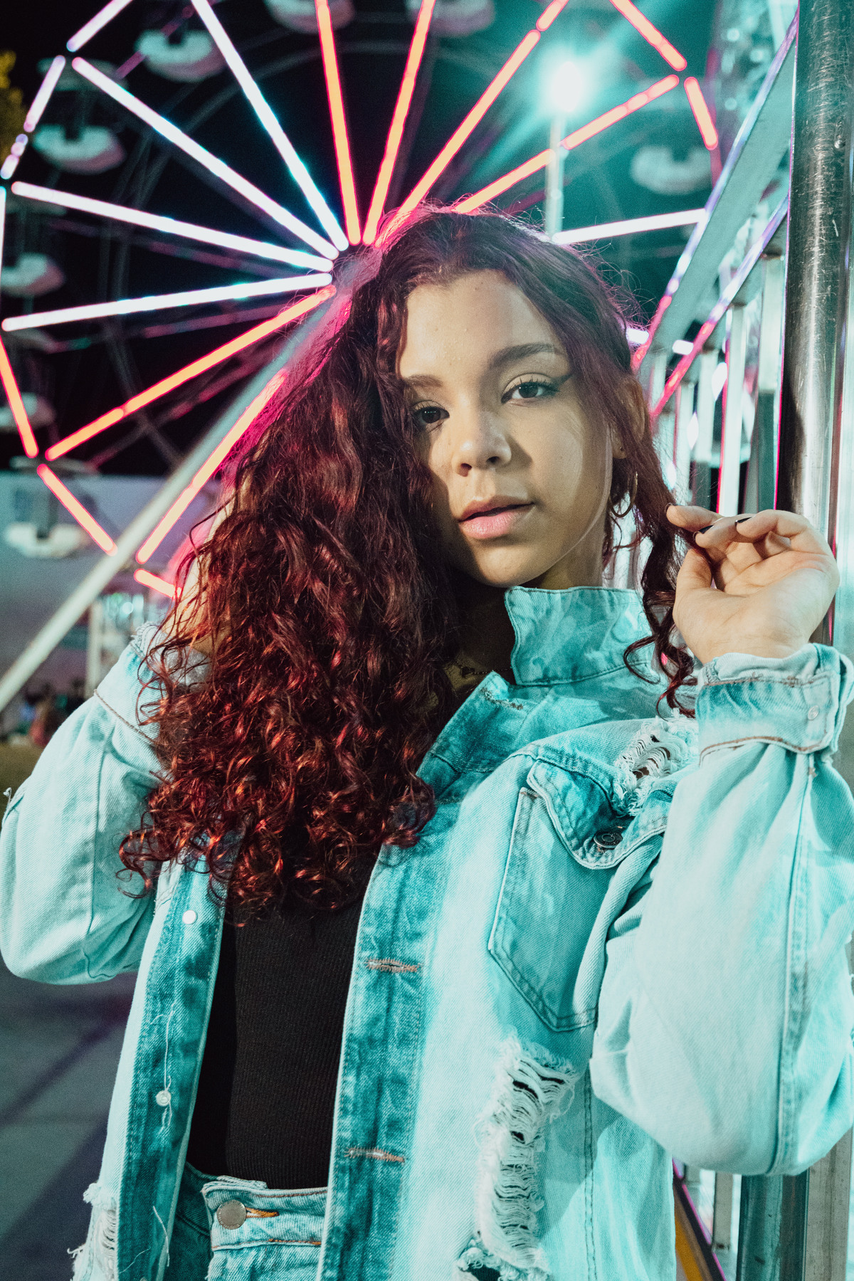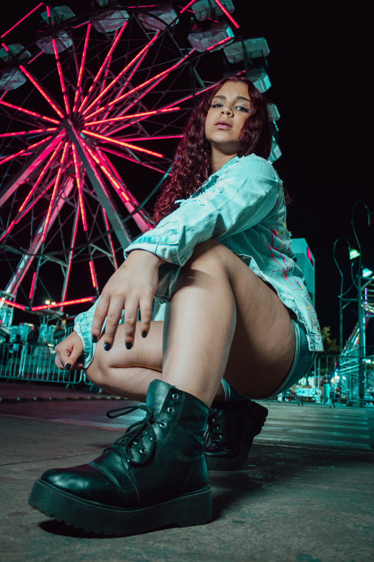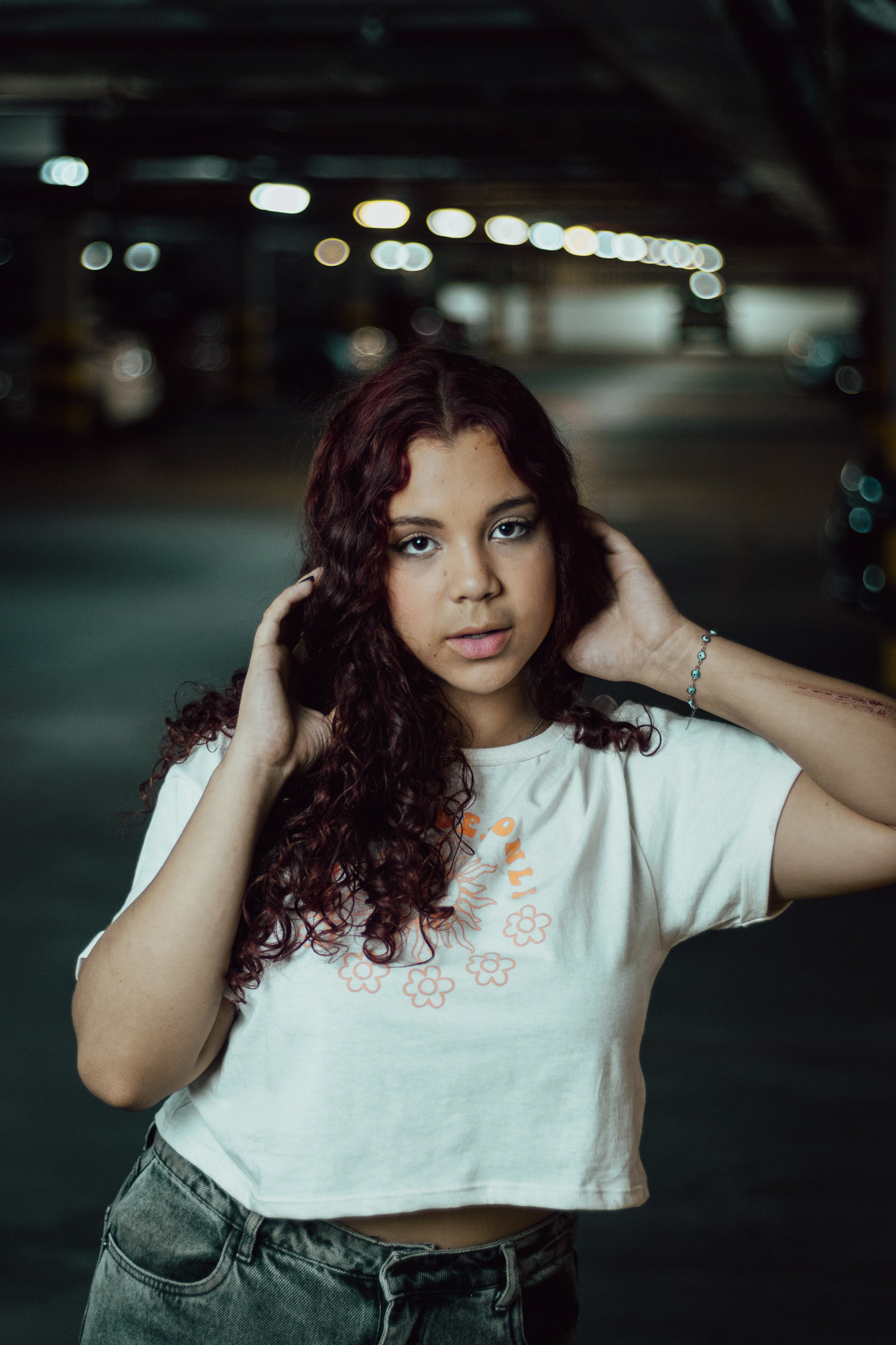 Este ensaio foi uma experiência única, realizada no estacionamento movimentado do shopping e no parque de exposição lá presente. Utilizamos luzes coloridas para criar um ambiente vibrante e contemporâneo, que combinava perfeitamente com a estética urbana que buscávamos.